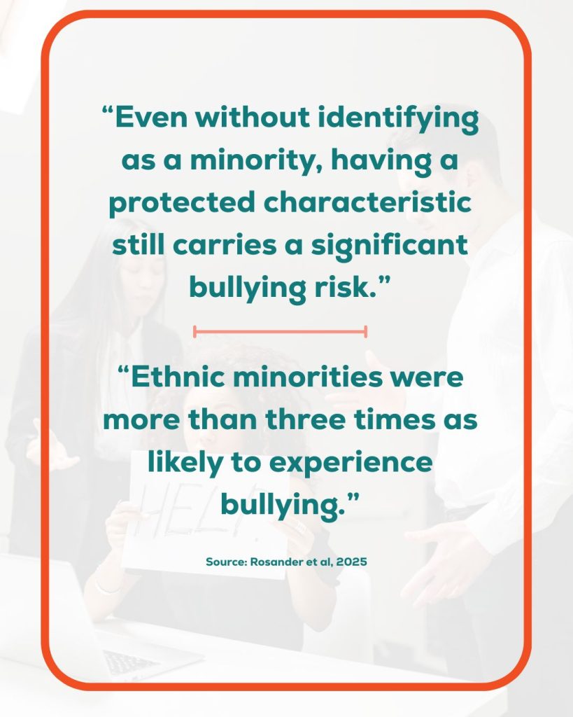A recent study (Rosander et al, 2025) on protected groups (including disability, ethnicity, gender, religious, and sexual identity) compared the likelihood of them being bullied at work compared to non-protected counterparts.